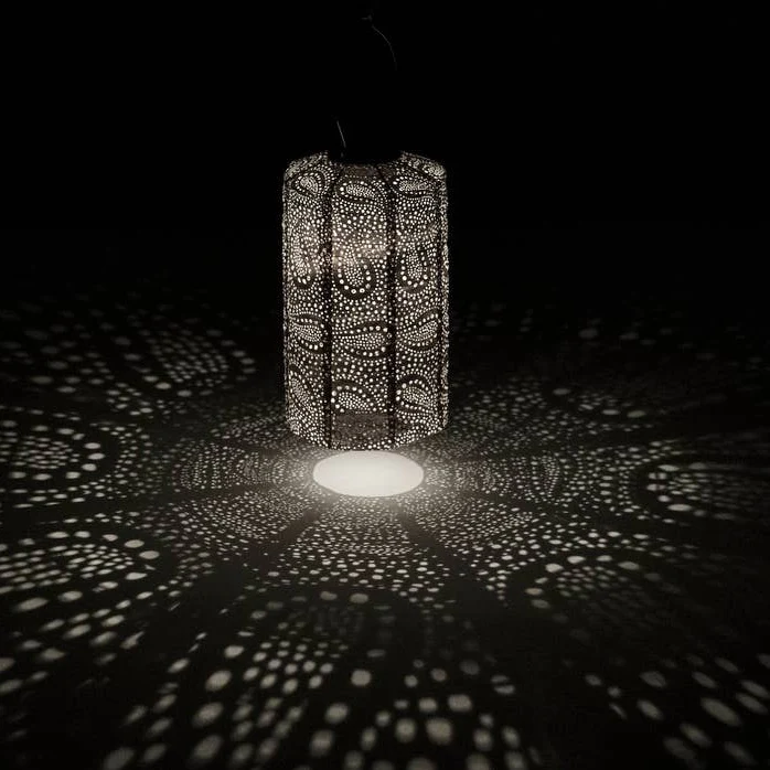 Hämärän laskeutuessa aurinkokennolyhty herää eloon. Lämmin LED-valo siivilöityy tarkasti leikatuista kuvioista ja heijastuu pehmeästi ympäristöön – luoden tunnelman, joka näkyy myös lyhdyn ulkopuolella.